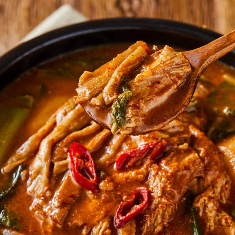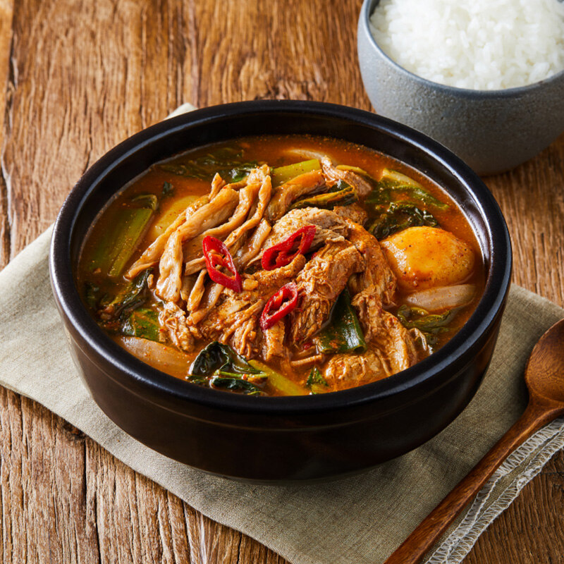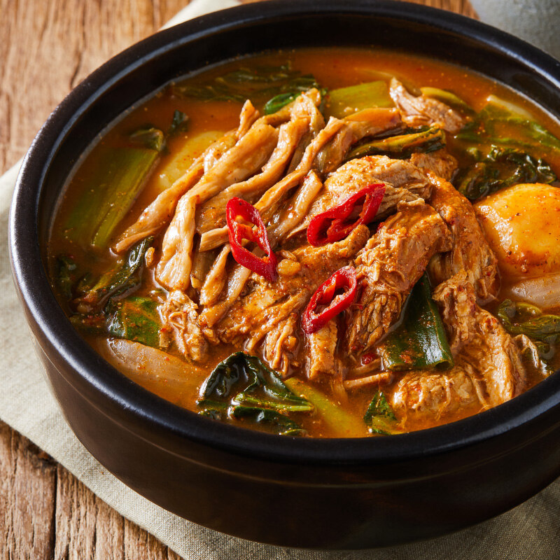 쫄깃한 토란대부터 구수한 우거지, 향긋한 깻잎, 포슬포슬한 감자까지. 건더기만 보아도 푸짐함에 기분 좋아지는 토란대 순살 감자탕을 소개해요. 돼지 뼈를 푹 고아낸 진한 육수에, 뭉근히 삶은 뒤 결대로 찢은 살코기를 듬뿍 넣어 한층 깊은 국물 맛을 완성했어요.