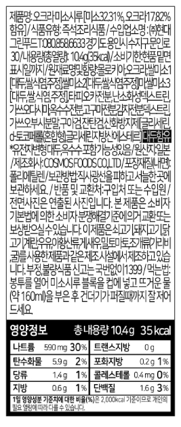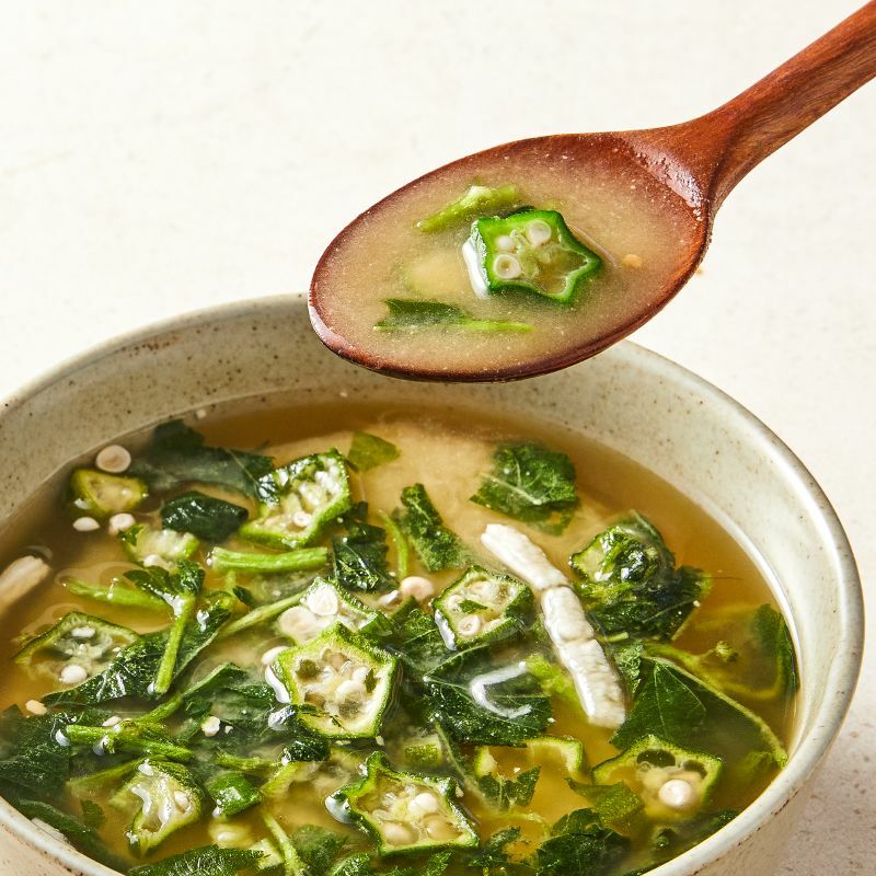 바쁜 일상의 수고로움을 덜어줄 코스모스의 오크라 미소시루를 소개해요. 된장과 건더기를 따로 동결건조하여 원재료 그대로의 식감과 맛을 보존했어요. 평소 챙겨 먹기 힘든 오크라, 참마를 넣어 색다른 식감과 영양을 더했답니다. 쌀을 섞어 만든 쌀 된장 등 3가지 된장을 배합해 깊은 국물 맛이 일품이에요.