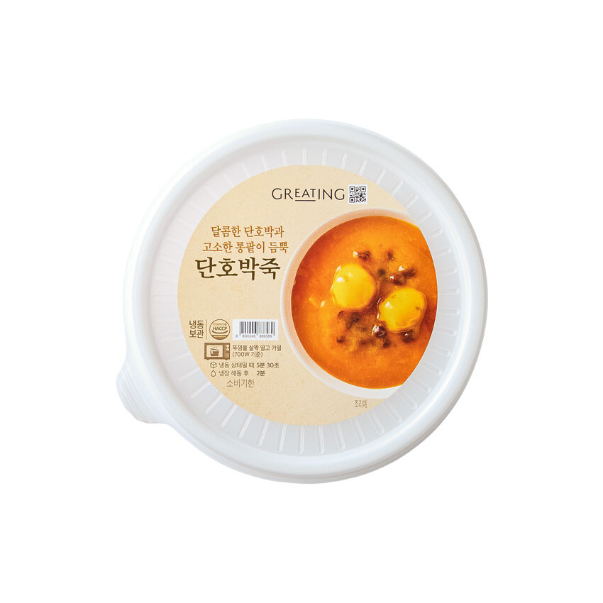단호박죽을 떠올리면 절로 포근해지는 단호박의 부드러운 식감이 생각나요. 그리팅은 여기에 당근을 곱게 갈아 넣어 자연스러운 단맛을 더했어요.