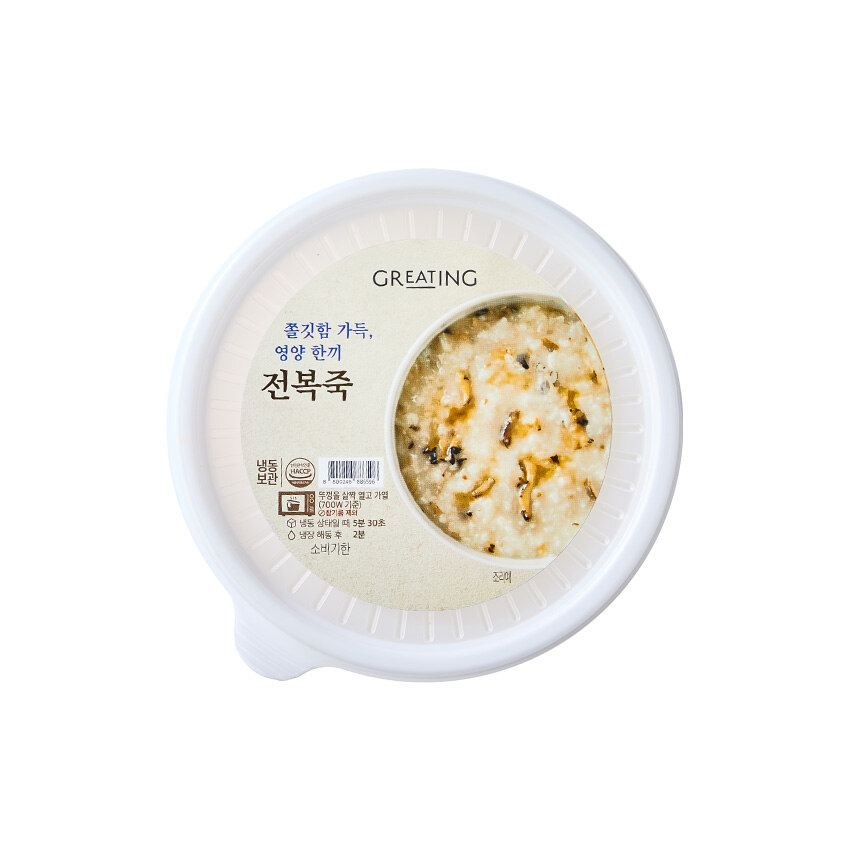 몸이 무겁게 느껴지는 날이면 가장 먼저 생각나는 한 끼, 전복죽 이에요. 바지락을 넣고 시원하게 끓여 낸 육수에 탱탱한 전복과 소라살을 먹기 좋게 다져 넣었어요. 여기에 버섯도 함께 넣어 육지와 바다의 영양을 동시에 담았답니다. 그리팅에서 보양과 위로의 마음을 담은 전복죽 한 그릇을 만나보세요.