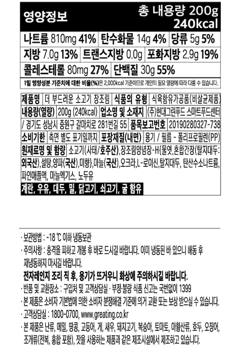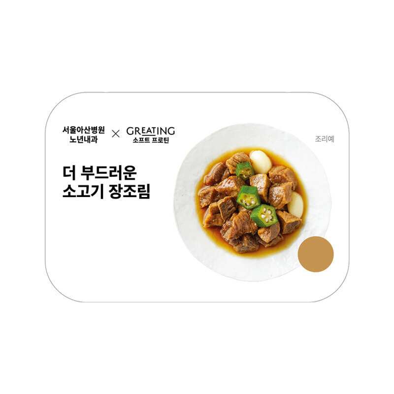단백질 함량은 높지만 퍽퍽해서 먹기 힘든 소고기 장조림, 이제 소프트프로틴과 함께 부담없이 즐겨보세요. 그리팅의 더 부드러운 소고기 장조림은 사태 부위를 포화 증기 기술로 부드럽게 만든 뒤, 건강 식재인 통마늘과 오크라를 더해 맛있게 조려내 완성했답니다.