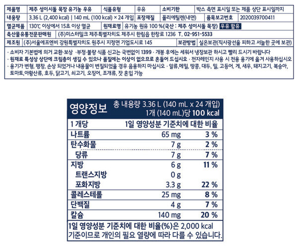 [제주성이시돌목장] 유기농 멸균우유 (140ml*24입)