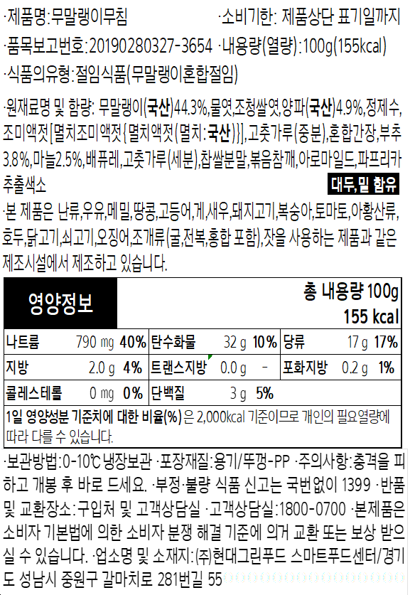 입맛이 없을 때 유달리 생각나는 반찬, 무말랭이 무침입니다. 조청과 배즙으로 감칠맛을 더한 양념은 매콤하면서도 은은한 단맛이 나요. 밥반찬 이외에도 죽 요리, 충무김밥 등에 곁들여 드셔도 좋아요.